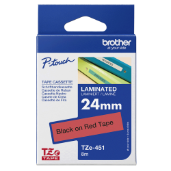 Originálna kazeta TZe-451 s laminovanou červenou páskou s potlačou čiernej farby. Vhodná na bežné aplikácie, v pracovnom či domácom prostredí. Je kompatibilná s tlačiarňami Brother P-touch.